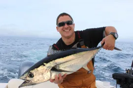 Fishing Albacore Tuna is an emerging fishery in British Columbia. Albacore run 15-35 pounds off the coast of BC and can often be caught in large numbers. Spend the day trolling fast in the warm, clear BlueWater in the canyons beyond the continental shelf. We have the boat for it, the 'Red Sky' is equip with outriggers and dive boards to optimize the spread of our Tuna gear. Please call Lochie for further details. 1.877.537.6444